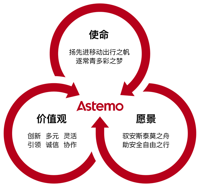 安斯泰莫(Astemo)是“Advanced Sustainable Technology for Mobility”的首字母组合,寓为未来安全舒适的移动出行提供可持续先进技术之企业意愿。